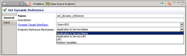 Use the General tab to specify the name and description of the Set Dynamic Reference task, and to set the target interface and endpoint reference mechanism.