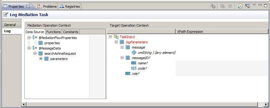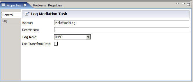 You can set a property on the mediation flow for the Log task to use at run-time, to override the Log Role setting in the General tab if they are different. For example, you might set the Log Role to debug during development, but set the run-time property to info.