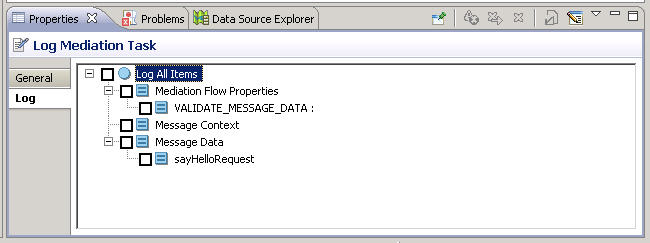 After adding a log task to a path within a mediation flow, specify the type of information you want to log. The Log tab of the Log task configures the information to send to the log file.