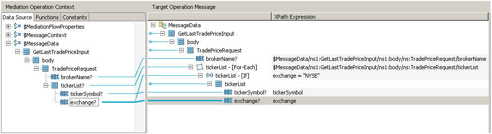 In this example, the requestor sends a list of ticker symbols and the stock exchanges on which they are traded. The mediation flow routes the request to different services for each stock exchange. The For Each statement takes the list of ticker symbols and executes the remaining statements once for each symbol in the list. The If statement examines the exchange element and outputs only the ticker symbols for the "NYSE" stock exchange.