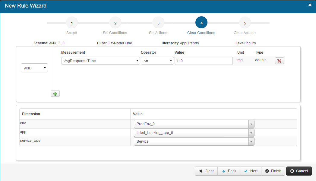 4. Declare the clear action to monitor if the AvgResponseTime returns to the accepted range:
