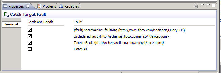 In the above example Catch fault task, one fault message is defined on the target operation named searchAirline_faultMsg. The Catch Fault task also has the following faults listed for all target operations: