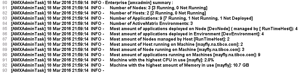 This snippet of the CLI output shows the Enterprise summary from the perspective of which entity is "Most"-used. Lines 81 through 84 summarize the TIBCO ActiveMatrix entities and their respective runtime status. Lines 85 through 90 summarize the Enterprise state in terms of statistics such as highest number of applications deployed on a given Node, and so on.