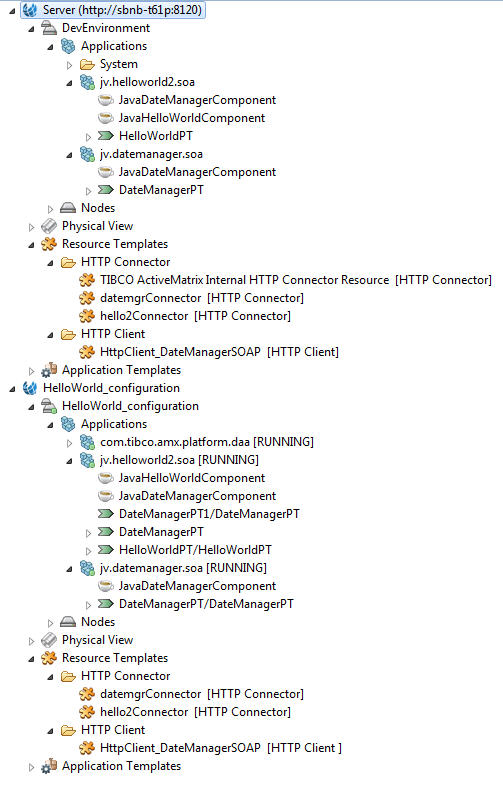The format of the objects in the Administrator Explorer view varies depending on whether the objects are running on a remote or local debug node. For example, in Administrator Explorer View, the objects under the jv.helloworld2.soa application are slightly different. On the remote node managed by the Administrator server named Server, the application shows two components (JavaDateManagerComponent and JavaHelloWorldComponent) and one service, whereas on the local node managed by the HelloWorld_configuration run configuration, the application shows the same two components, the same composite service, and two component services (DateManagerPT1/DateManager and DateManagerPT).