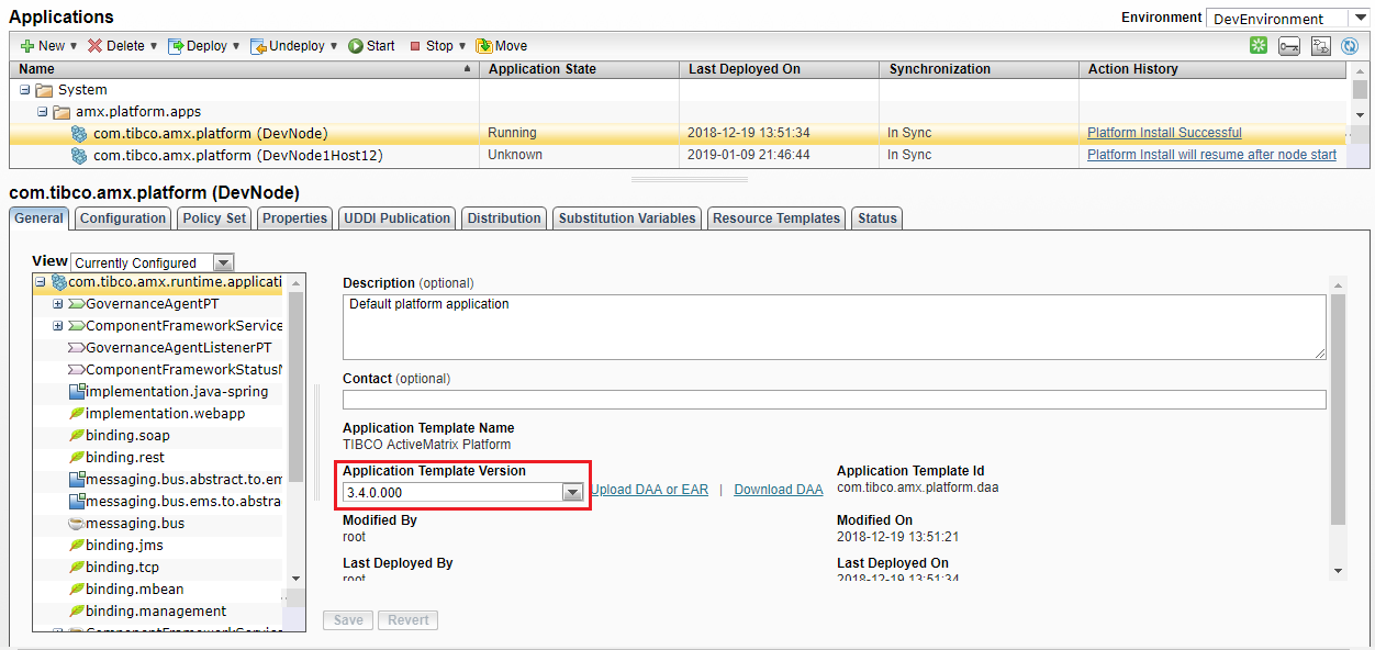 After upgrading to ActiveMatrix 3.4.0, the platform application (com.tibco.amx.platform) version is changed to 3.4.000. This can be verified from the Applications screen of the ActiveMatrix Administrator UI.