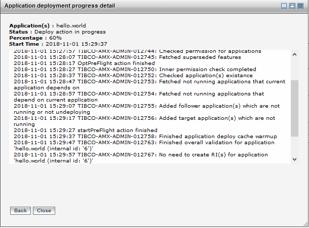 [AMXAdminTask] 16 Aug 2018 19:06:02  INFO - TIBCO-AMX-ADMIN-012762: Created tasks to deploy applications, Progress: 60%