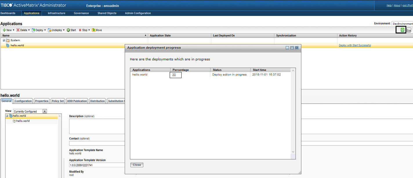 [AMXAdminTask] 16 Aug 2018 19:06:04  INFO - Deploying Application 'hello.world' in background : TIBCO-AMX-ADMIN-012015: Deployment succeeded for application 'hello.world' at 8/16/18 7:05 PM on node(s): 'DevNode'.