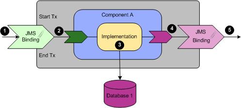 • The JMS binding's outgoing message (5). The message is sent to the referenced service when the transaction is committed.