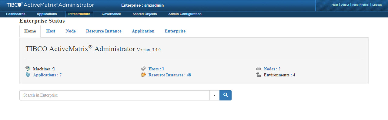 The Home tab provides a summary of the Enterprise. It provides the total count of the following entities in the Enterprise.