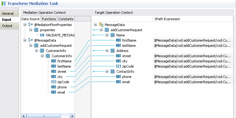properties in the Input tab of the Transform Mediation Task panel. You can see