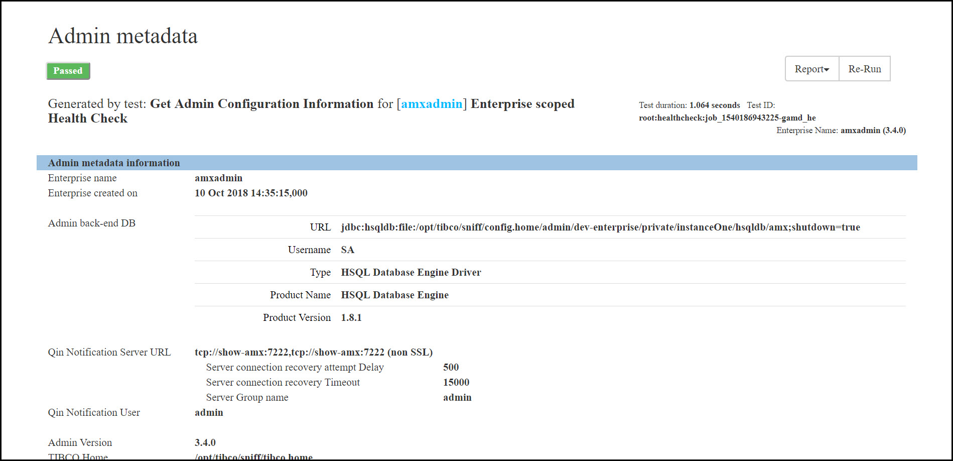 Click the Get Administrator Configuration button for information about configuration (Metadata) of TIBCO ActiveMatrix Administrator. When the execution of test is completed, you can view the report by clicking the Review button as shown in the following image.