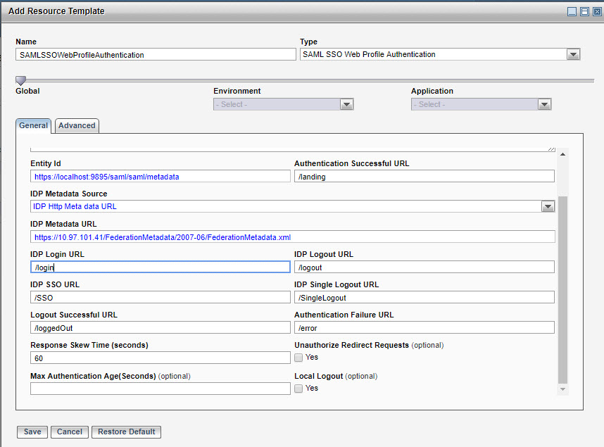 • Resource template and resource instance of type SAML SSO Web Profile Authentication must be created and installed using Administrator UI or CLI.
