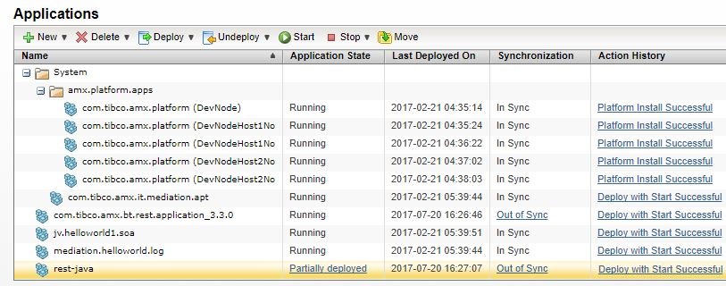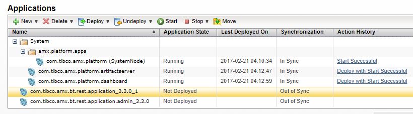 After downgrading to ActiveMatrix 3.3.0 or ActiveMatrix 3.2.0, the newly created REST BT System Applications are Out of Sync and in the Not deployed State.