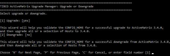 As an example, these console windows show how to upgrade all the Hosts in an enterprise to ActiveMatrix 3.4.0. The procedure for downgrading in the console mode is the same.