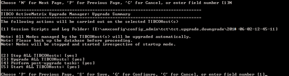 - After you review the pre-installation summary, type G to start the upgrade process. You can also select options to "Stop", "Upgrade", "Perform post-upgrade task" and "Start" by selecting the appropriate field number. When configuration completes, you can select a second configuration option or type q to quit.