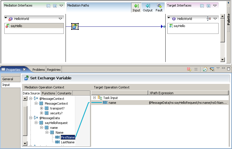 Input tab of the Set Exchange Variable task is a mapper panel that enables you to set any portion of the exchange variable for the currently selected operation.