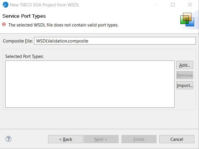• You cannot create a new project using File > New > TIBCO SOA Resource project and then provide either an existing Service Health Check port type or import a new WSDL that has a Service Health Check namespace (http://www.tibco.com/healthcheck/) in it. An error message is displayed if you attempt to import a Service Health Check WSDL while using this WSDL.