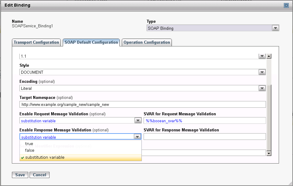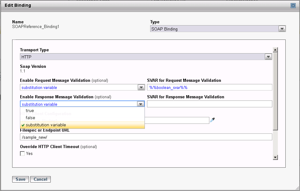 The Enable Request Message Validation and Enable Response Message Validation fields can also be configured as Substitution Variables by selecting the substitution variable option, as shown in the following screens. Selecting the substitution variable option enables a text box where you can enter the name of the Substitution Variable. The Substitution Variable name must start and end with %%. If the name is not typed correctly, an error is displayed when the Binding is saved.
