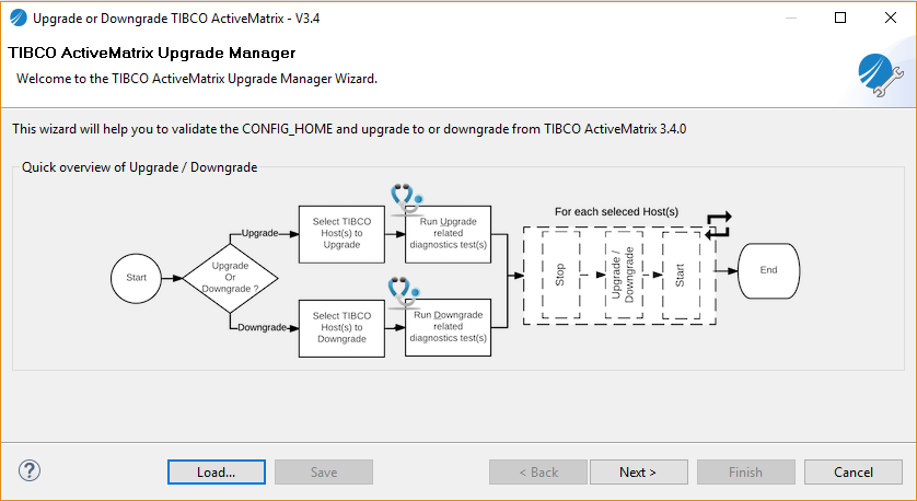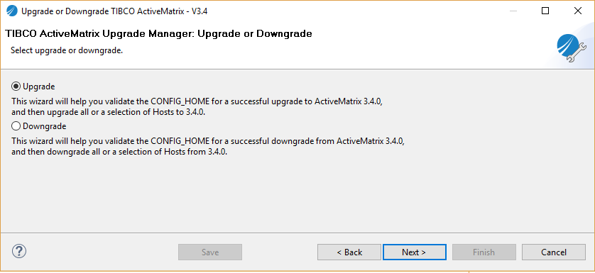 - Select Upgrade or Downgrade TIBCO ActiveMatrix - V3.4. The overview workflow of both upgrade and downgrade path is displayed.