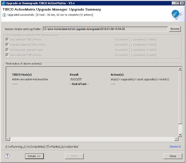 - Click Upgrade. This will perform the actions listed to upgrade the selected Hosts and returns a summary as shown below. Execution logs and scripts are also stored under the folder listed in the Session Scripts and Log Folder location.
