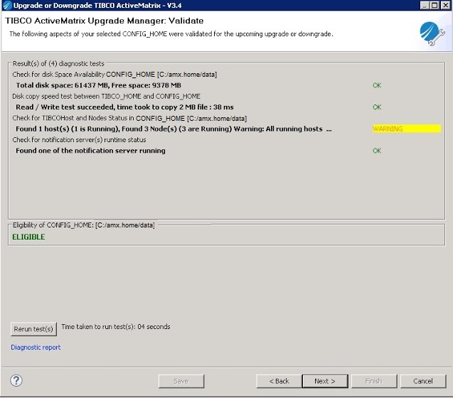 On this screen, TCT runs some diagnostic tests on the selected CONFIG_HOME. The screen shows whether the selected CONFIG_HOME is ELIGIBLE for an upgrade. Warnings are highlighted. You can also re-run the tests after the errors highlighted by the warnings are fixed.
