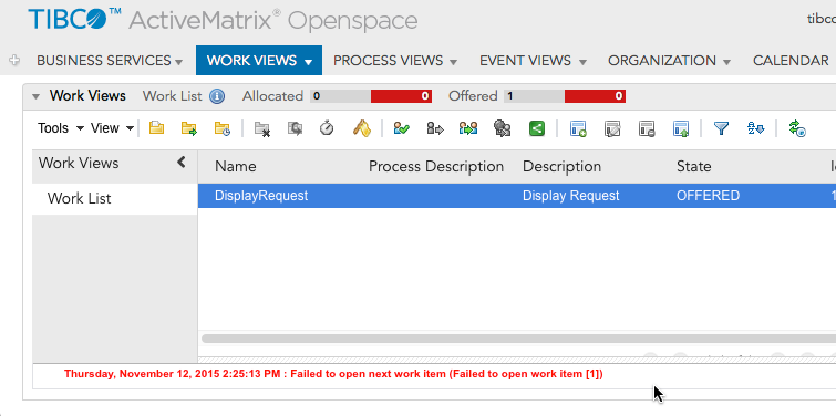 If the BPM User tries to open/finish these PFU Components (or Work Items) from BPMNode2, an error message is displayed indicating that the Work Item isn't available, as shown in Figure 5.