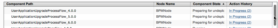As seen in Figure 4, the PFU Component UserApplicationUpgradeProcessFlow (Versions 4.0.0, 5.0.0 and 6.0.0) are not available on BPMNode2 node.