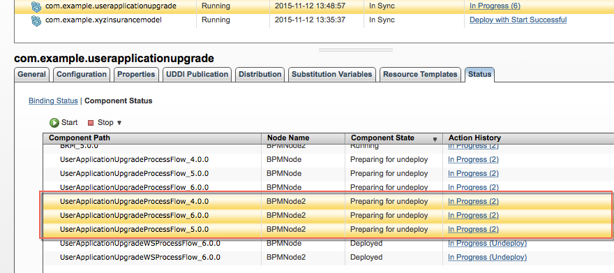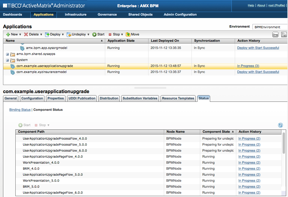 As shown in Figure 1, the TIBCO ActiveMatrix BPM user Application com.example.userapplicationupgrade is deployed on the BPM Node BPMNode, and has been upgraded several times. Since each of the past versions 4.0.0, 5.0.0 and 6.0.0 has one or more pending Work Item(s), the Components from those versions are in the 'Preparing For Undeploy (PFU)' state. For instance, the UserApplicationUpgradeProcessFlow Component of all three versions are in the PFU state.