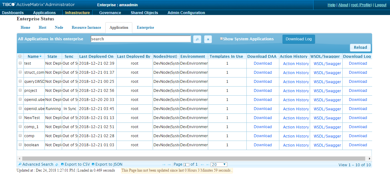 - Nodes(Host): Name of the Node or Host on which the Application is running. For each Node, the Host name is provided in brackets. All the Nodes on which this Application is distributed are displayed separated by the "|" character.