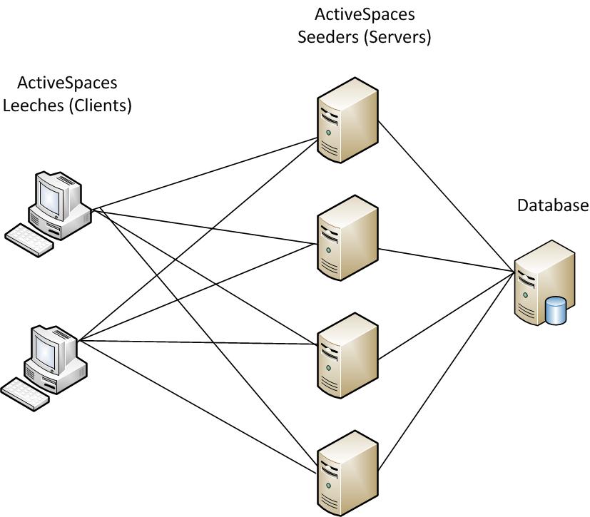 Figure 2, Deployment with Shared-All Persistence shows all of the seeder nodes in an ActiveSpaces cluster sharing a single database for persistence and data recovery.