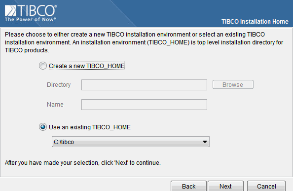 - To use an existing TIBCO_HOME directory, leave the checkbox for Use an existing TIBCO_HOME checked. If you want to install in another directory, check the Create a new TIBCO_HOME check box and specify a new TIBCO_HOME directory.
