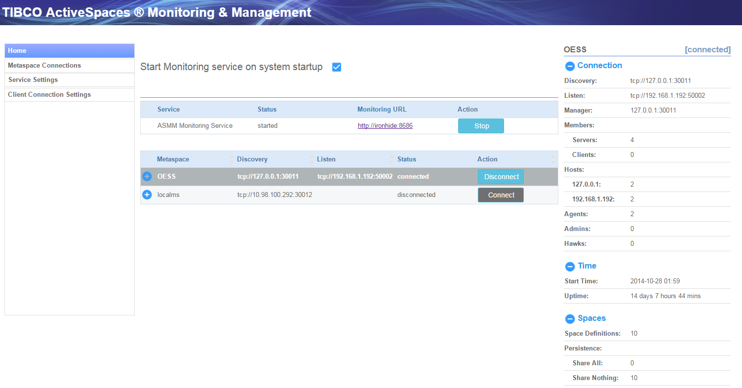 | Connection status | The name of the monitored metaspace and the current connection status. |