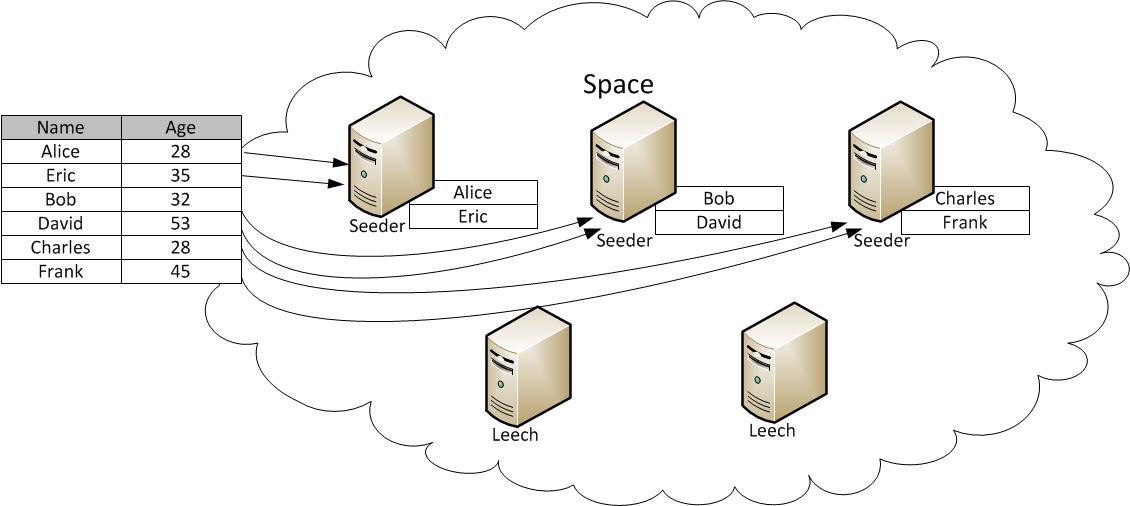 At any time, one member of the space—the seeder, is in charge of managing the entries for the space. The scalability of the space is limited to the number of entries that the single seeder can manage.