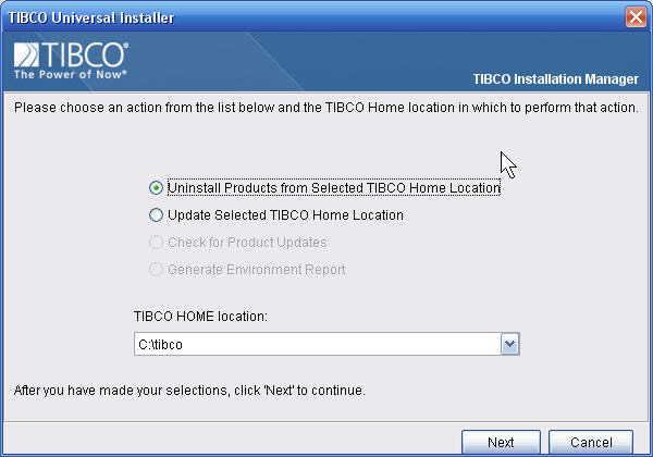 TIBCO_HOME, or you can uninstall specific products that have been installed in a