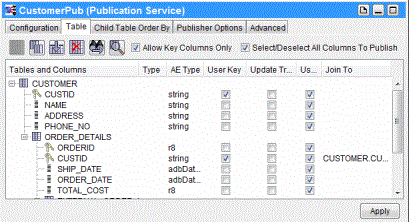 To add child tables for parent-child relationships, perform the following steps in the Publication Service Table tab: