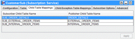 After adding child tables for a subscriber adapter, you create mappings between child tables on the publisher side and child tables on the subscriber side. For instructions, see Child Table Mappings Tab.
