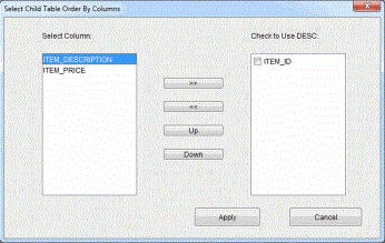 | 1. | Click a child table name, and then click Select Column. The Select Child Table Order By Columns dialog is displayed. |