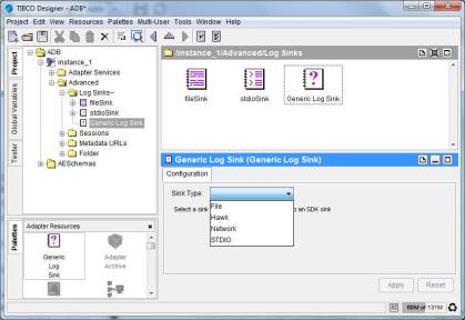 To create and configure the log sinks, select the Log Sinks folder inside the Advanced folder in the Project panel. You can customize the predefined file sink or STDIO sink, or create additional sinks for any of the following types by dragging a Generic Log Sink from the Palette panel to the Design panel.