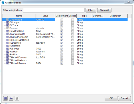 | • | Deployment Select the Deployment check box to make the variable visible and configurable when using TIBCO Administrator. If the check box is not selected, the variable is not visible in TIBCO Administrator. |