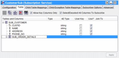 Check boxes are used for working on child columns and receiving the table columns. See Publication Service Tabs, Table Tab, Check boxes for more information.