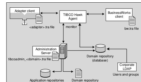 An administration domain is a collection of users, machines, and services. A domain is managed by an administration server, which is assisted by a TIBCO Hawk agent running on each machine in the domain.Figure 1 Components in Administration DomainIf TIBCO Enterprise Message Service is used as the transport, there is no need for secondary servers. (You can create secondary servers, but they are just like primary servers.) The only deployment option is Local, which means that client applications run independent of the administration server (unless an application performs certain operations that require connecting to the administration server, such as HTTP and SOAP authentication). See Deployment Choices for more information.Data about the machines, registered software, users, roles, access control lists, application configurations and deployment history is maintained for an administration domain. If you have configured a domain to use the TIBCO Enterprise Message Service as the transport, domain storage must be in a database. Domains configured to use TIBCO Rendezvous can store data in a file repository or in database. See Database and File-based Storage for details.The Hawk agent also builds local client.tra and .exe files when a client application is deployed, and on Windows platforms, creates NT services for applications.The TIBCO Administrator GUI provides a dialog to configure rulebases, set monitoring options, and display status. See the TIBCO Administrator User’s Guide for more information.