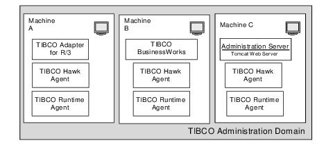 After you install TIBCO Administrator, the installer starts TIBCO Domain Utility to create the initial administration domain. An administration domain is a collection of users, machines, and services. Each domain is managed by an administration server, which is assisted by a TIBCO Hawk agent running on each machine in the domain. You can create multiple administration domains on the same machine and each domain must have a unique administration server associated with it.Figure 4 TIBCO Administration Domain