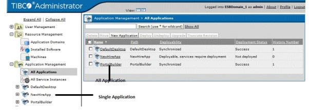 Application Management Overview The Application Management module allows you to create and deploy applications, and then start, stop, and monitor them. The module contains the application you have loaded into TIBCO Administrator. You can view all applications in the All Applications dialog or all service instances and process engines in the All Services dialog. Alternatively, you can configure and manage the service instances and process engines for an application under the application’s dialog. Figure 33 Application Management