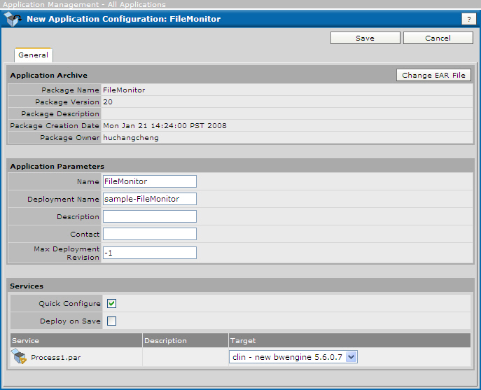 After creating the application, you specify deployment configuration information, such as which machines should run which services and processes in the application. You then deploy and start the services and processes from TIBCO Administrator.
