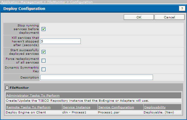 Click Deploy. The dialog similar to the following displays and informs you that all running processes with configuration changes in this application is stopped when you click OK to deploy. If the processes deploy successfully, they are restarted automatically if the corresponding checkbox was selected.