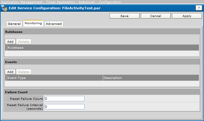 In the Configuration Builder panel, expand the bwtutorial application and click FileActivityTest.par, and then click the Monitoring tab.