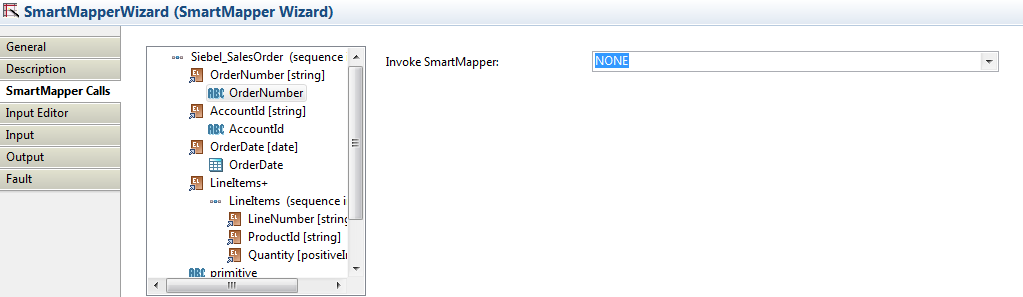 | Input Schema | Complex | The schema tree in the left pane. It is used to browse the input schema and select the nodes where a SmartMapper operation is invoked. |