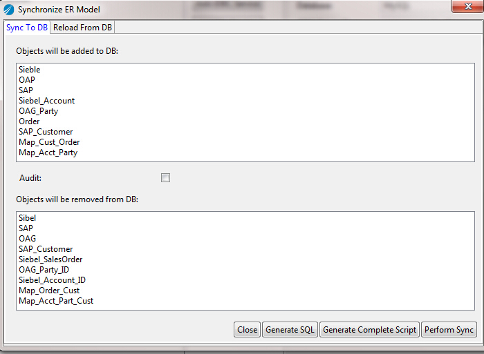 Synchronize ER Model dialog is displayed, containing two configuration tabs: