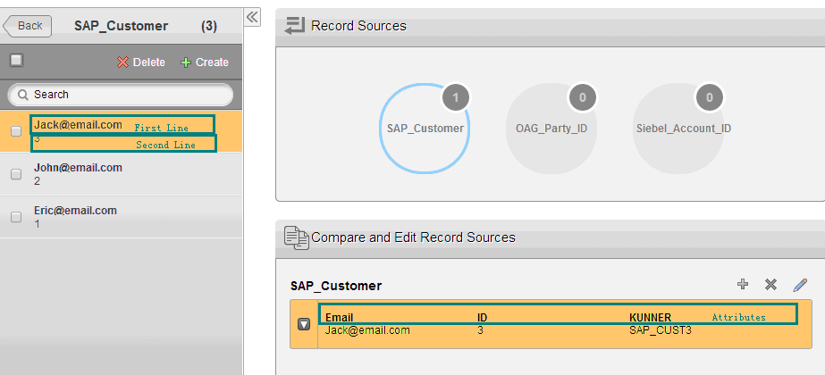 Take the SAP_Customer entity as an example, which is defined with three attributes, ID, KUNNER, and Email. ID is the key field. It is added to the Map_Acct_Party_Cust identity relationship, which assembles customer information across SAP, OAG, and Siebel systems.