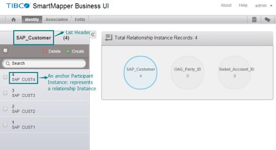 Take the Map_Acct_Party_Cust identity relationship as an example, which assembles a customer relationship across SAP, OAG, and Siebel systems. As shown, SAP_Customer is the anchor participant used to represent the Map_Acct_Part_Cust identity relationship, which has 4 participant instances. The attribute ID of SAP_Customer is the display field.